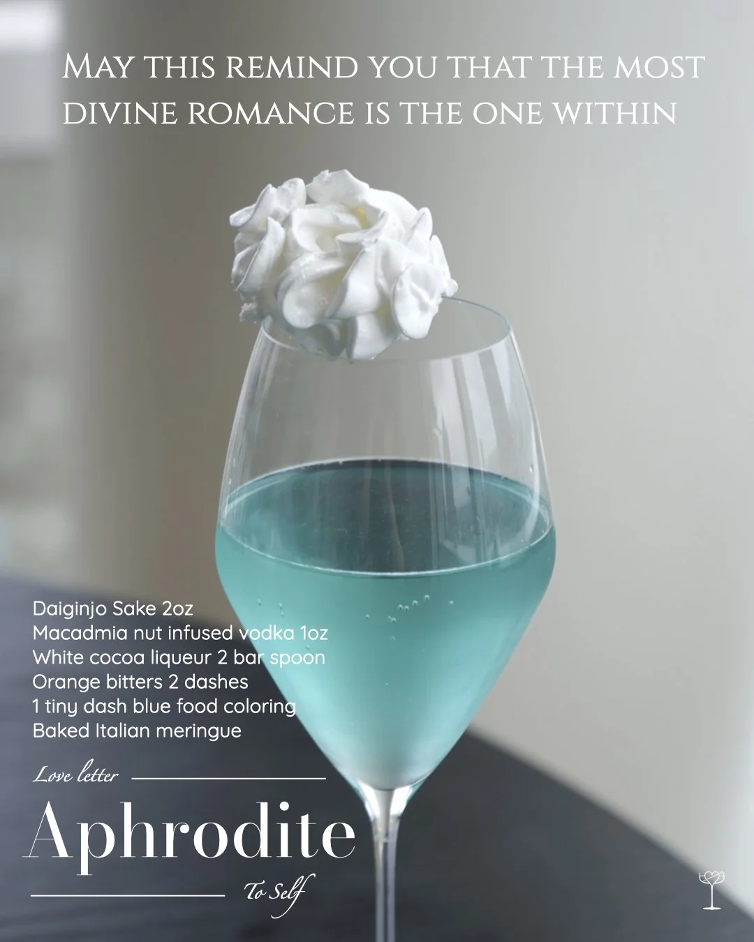 Aphrodite, the goddess of love and beauty, is deeply tied to the divine feminine and self-love, every spiritual girly knows this. A vodka-sake martini layered with macadamia nut, rice, and chocolate, seafoam in color (yes, I cheated with a dash of blue). Crowned with a sculptural Italian meringue, abstract in form.
