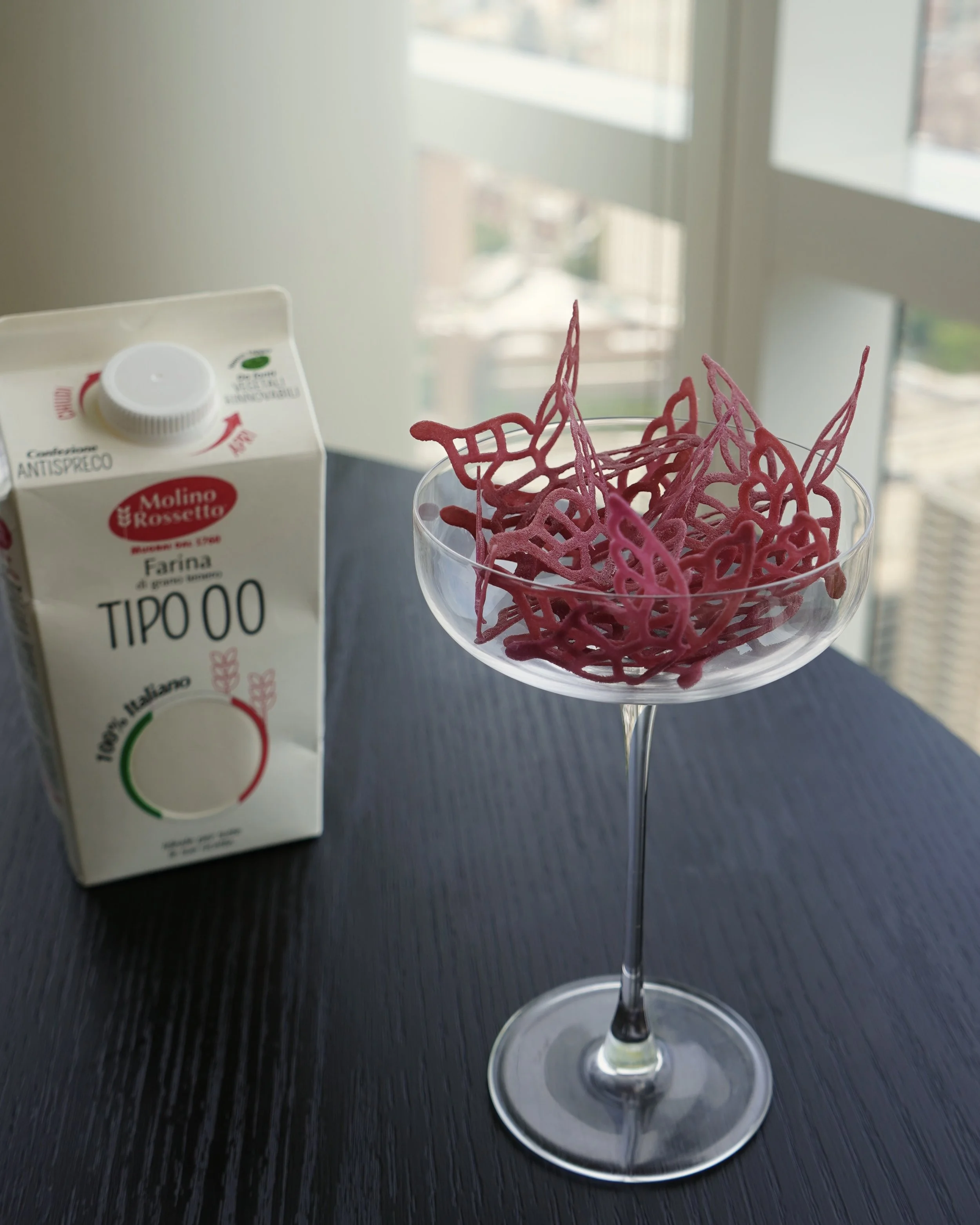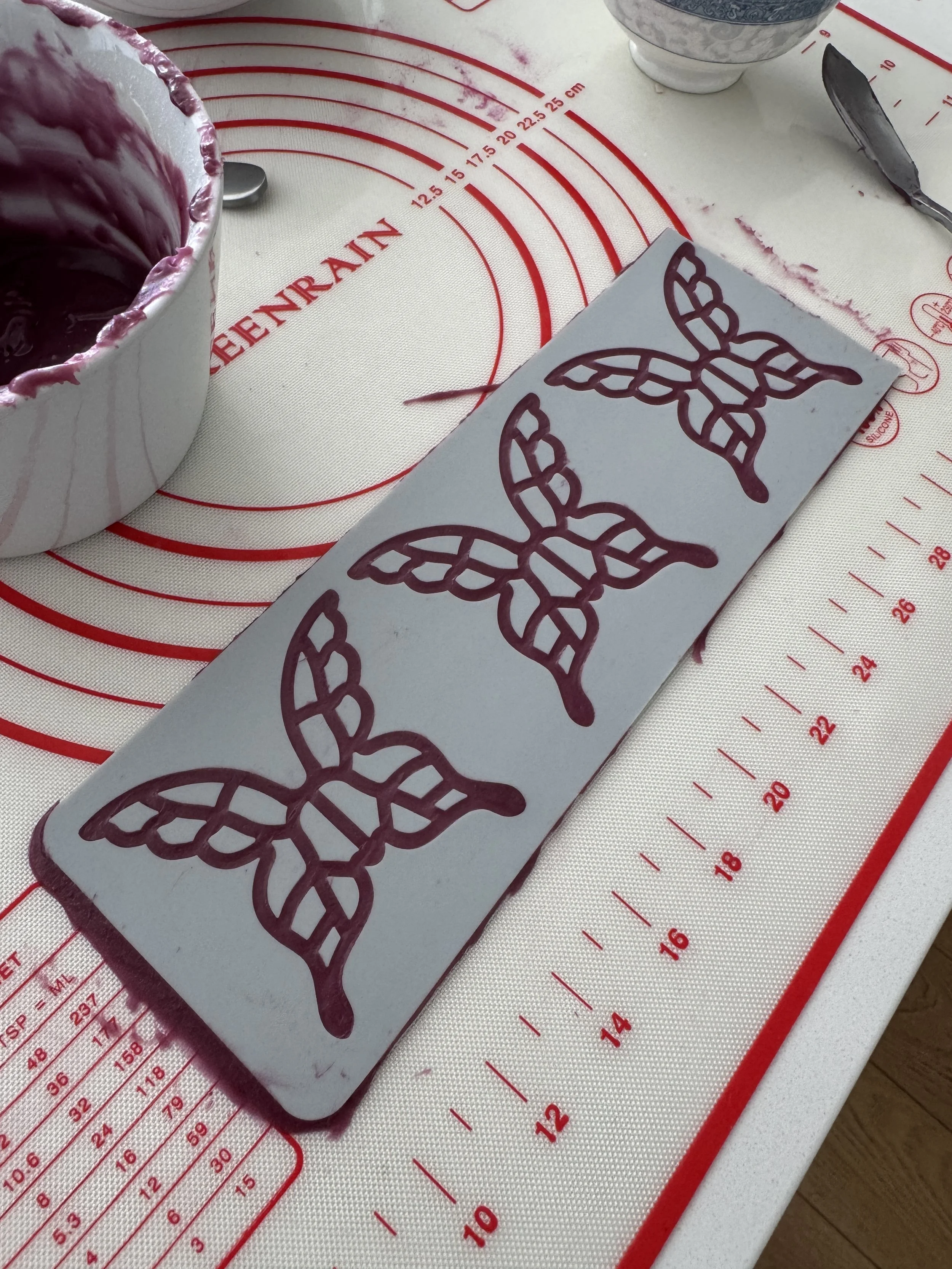 You should end up with a burgundy colored paste. Use a spreader to apply it onto the butterfly mold, then bake at 310°F for 6 minutes.