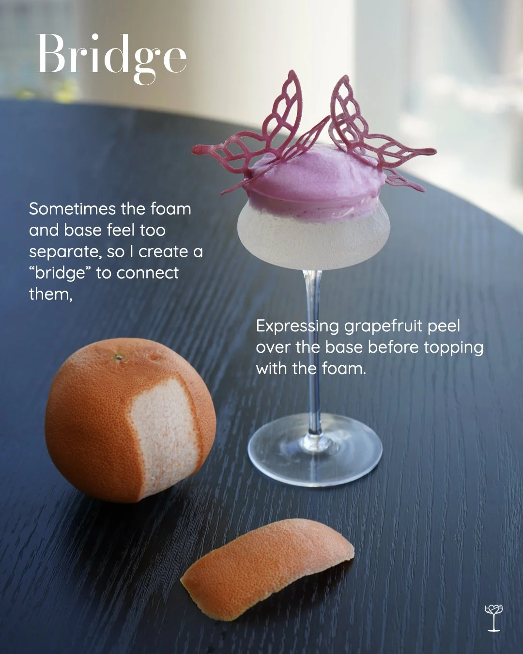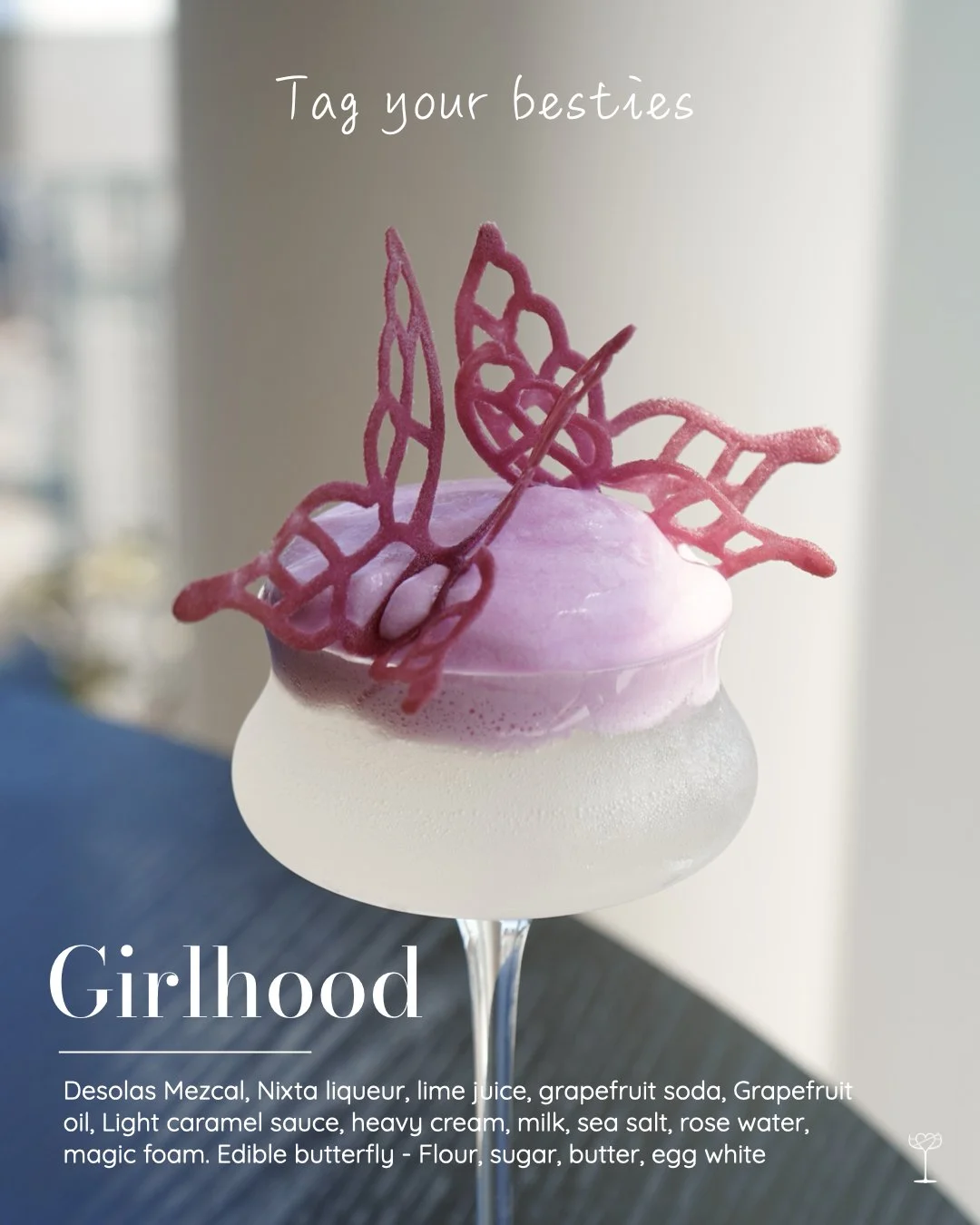 Desolas Mezcal, Nixta liqueur, lime juice, grapefruit soda, Grapefruit oil, Light caramelized sauce, heavy cream, milk, sea salt, rose water, magic foam.